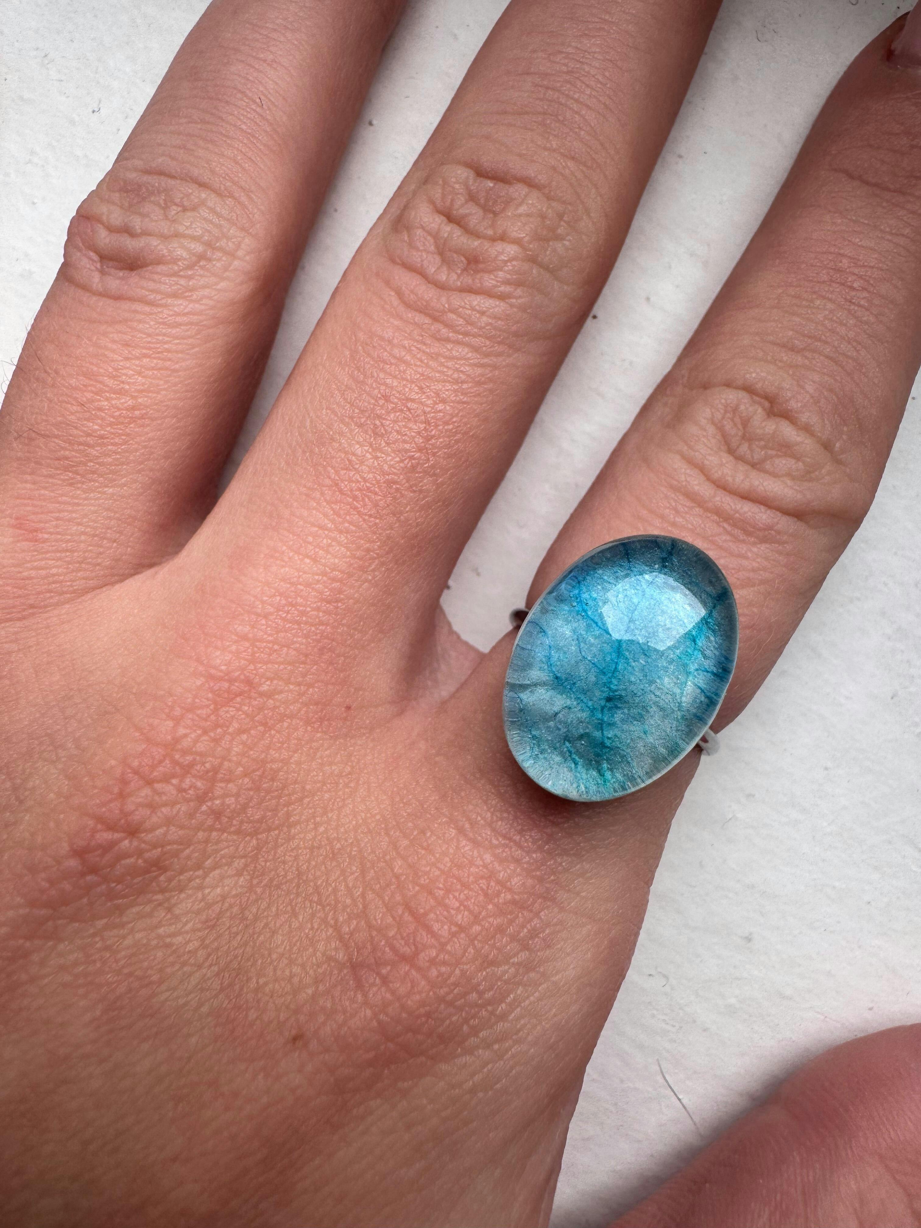 PRECIOSO 🩵 . Tiene unos tonos profundos y muy relajantes, con mucha sensación de calma y profundidad. El acabado es limpio y brillante, y la flor está perfectamente integrada en la resina. Puesto queda elegante y especial, se nota muchísimo el trabajo artesanal y el cuidado en los detalles. Lo recomiendo totalmente!!!!