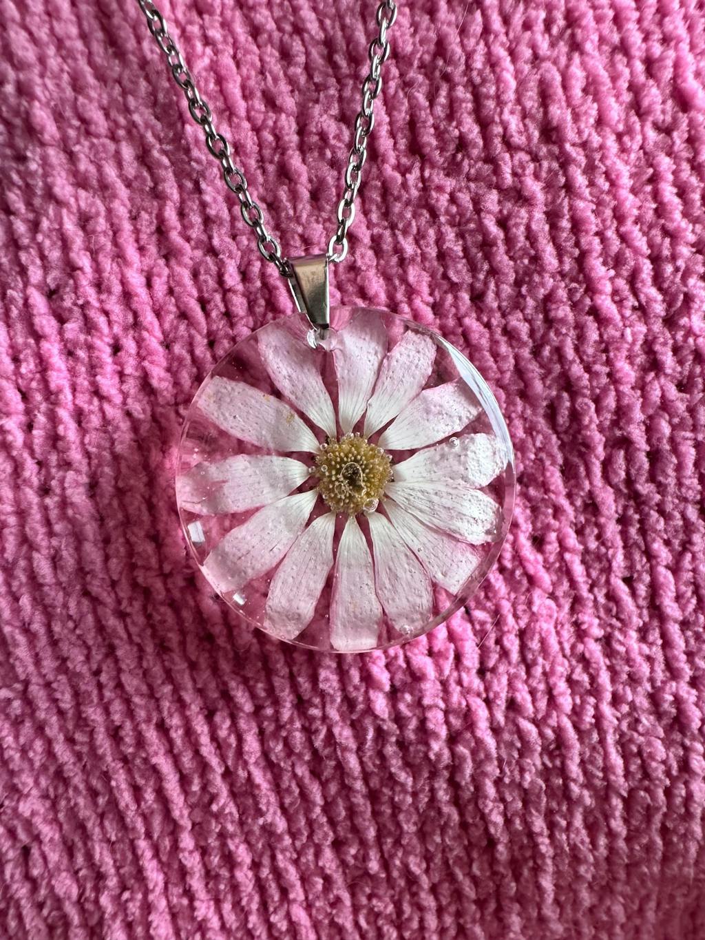 Collar de la flor de Cineraria Rosa, secada y encapsulada en resina