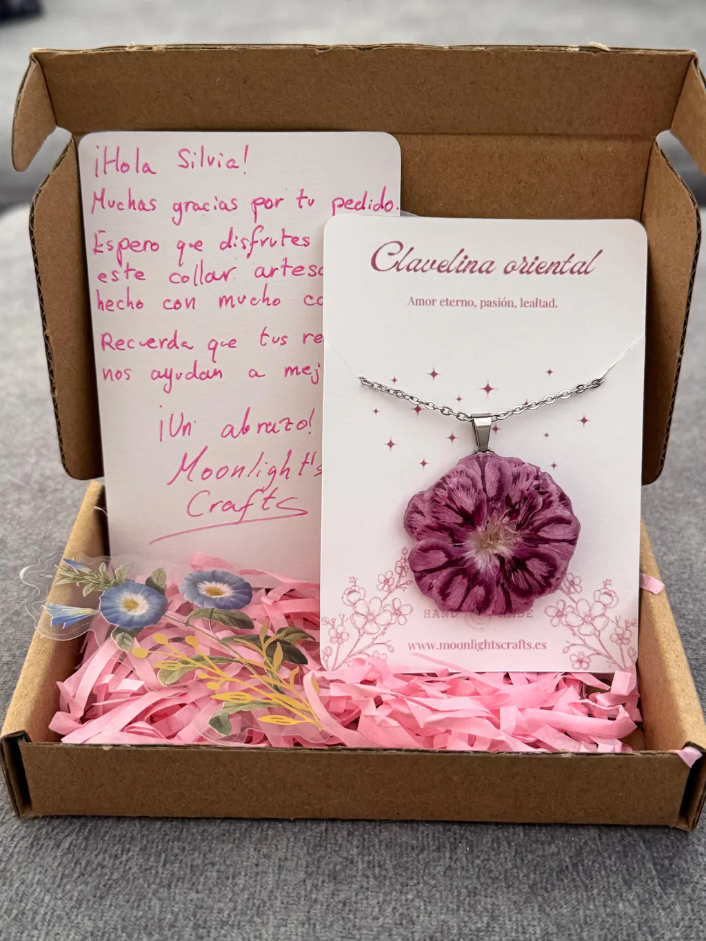 Sin duda uno de mis colgantes favoritos. La flor es preciosa, con un color intenso y lleno de matices que la hace muy especial. Además, la presentación es una maravilla: la cajita, el papel, la pegatina, la tarjeta escrita a mano… se nota el cariño en cada detalle. Da gusto recibir pedidos así!!!