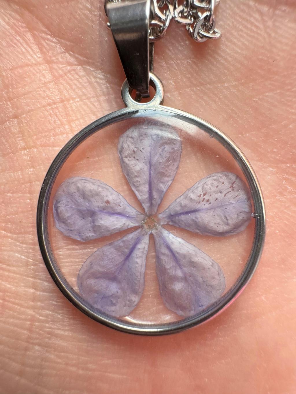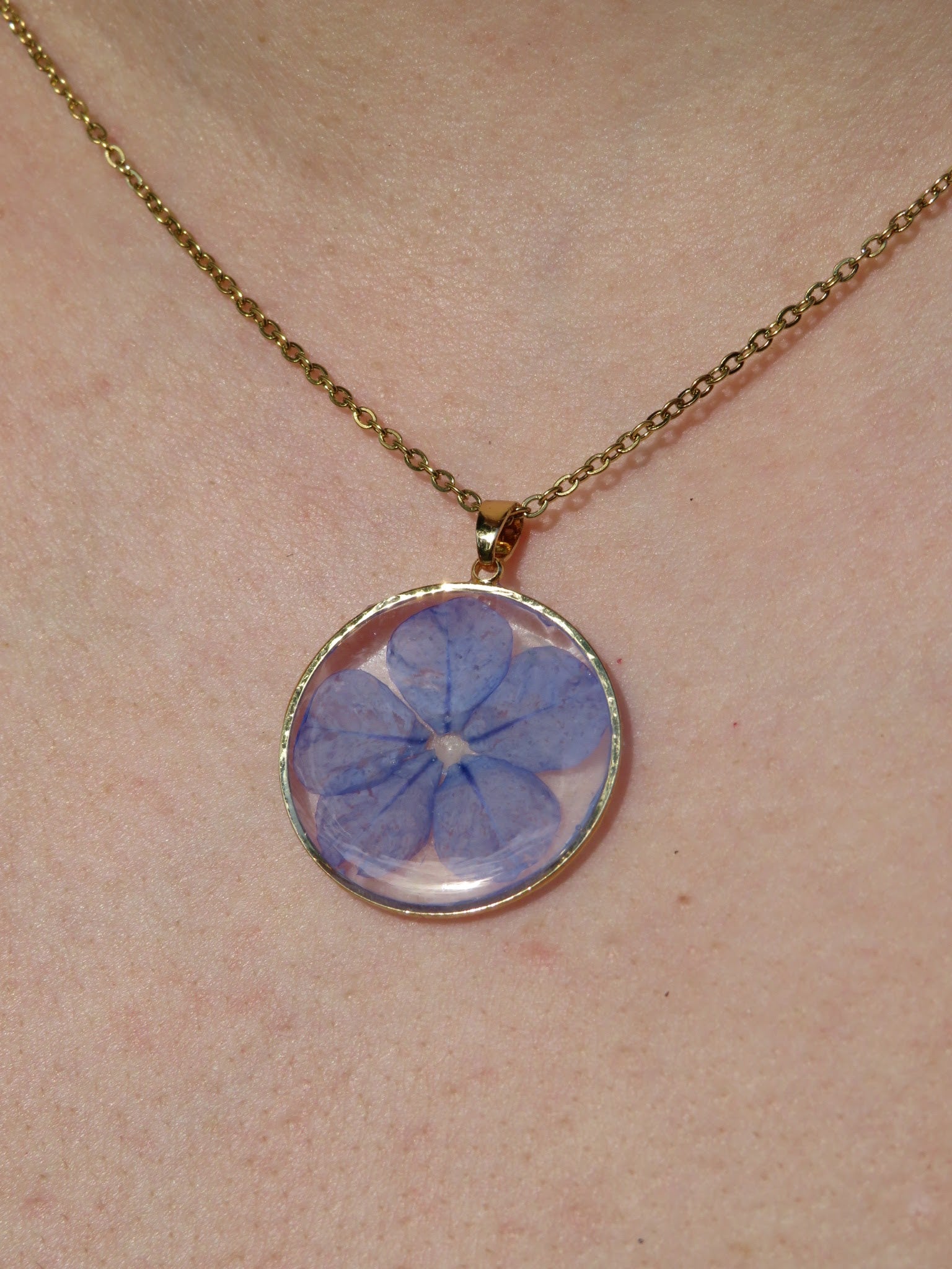 Collar hecho a mano, de acero inoxidable y resina UV. Todas las flores son recolectadas, secadas y encapsuladas para su conservación óptima en el tiempo.
