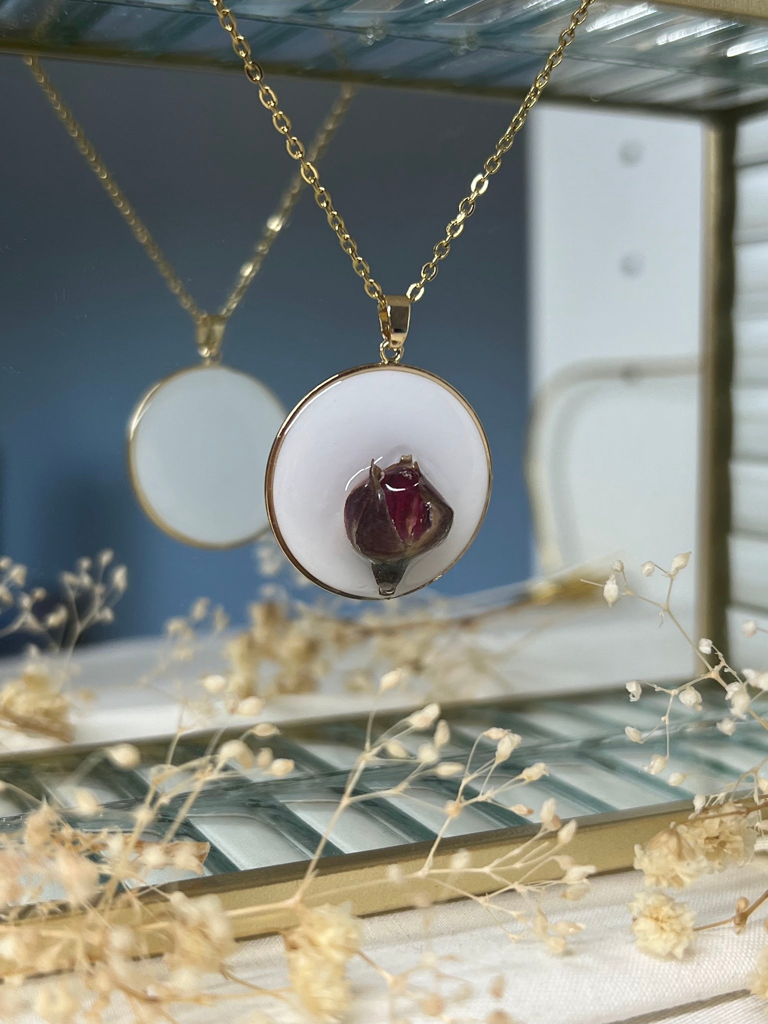 Collar hecho a mano, de acero inoxidable y resina UV. Todas las flores son recolectadas, secadas y encapsuladas para su conservación óptima en el tiempo.