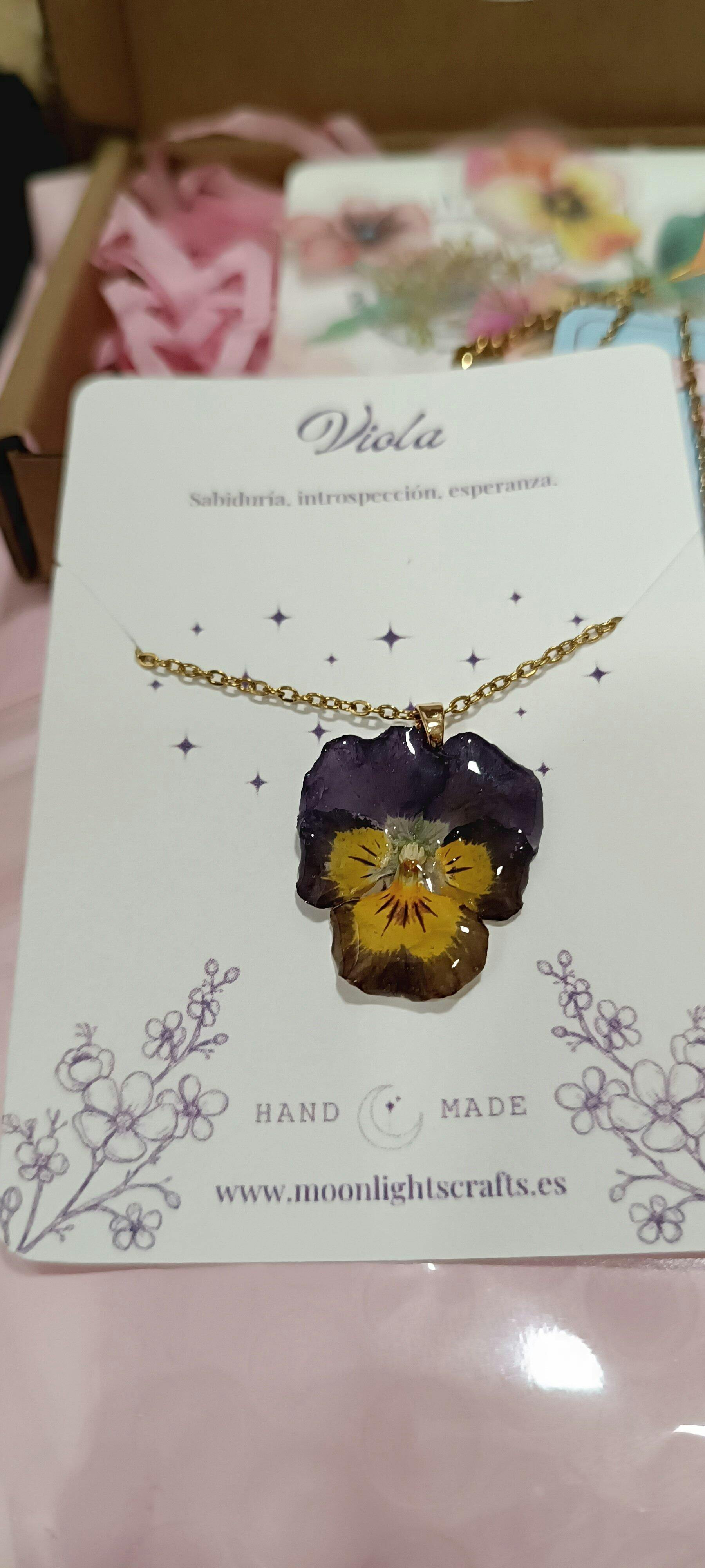 Collar de la flor Viola, secada y encapsulada en resina