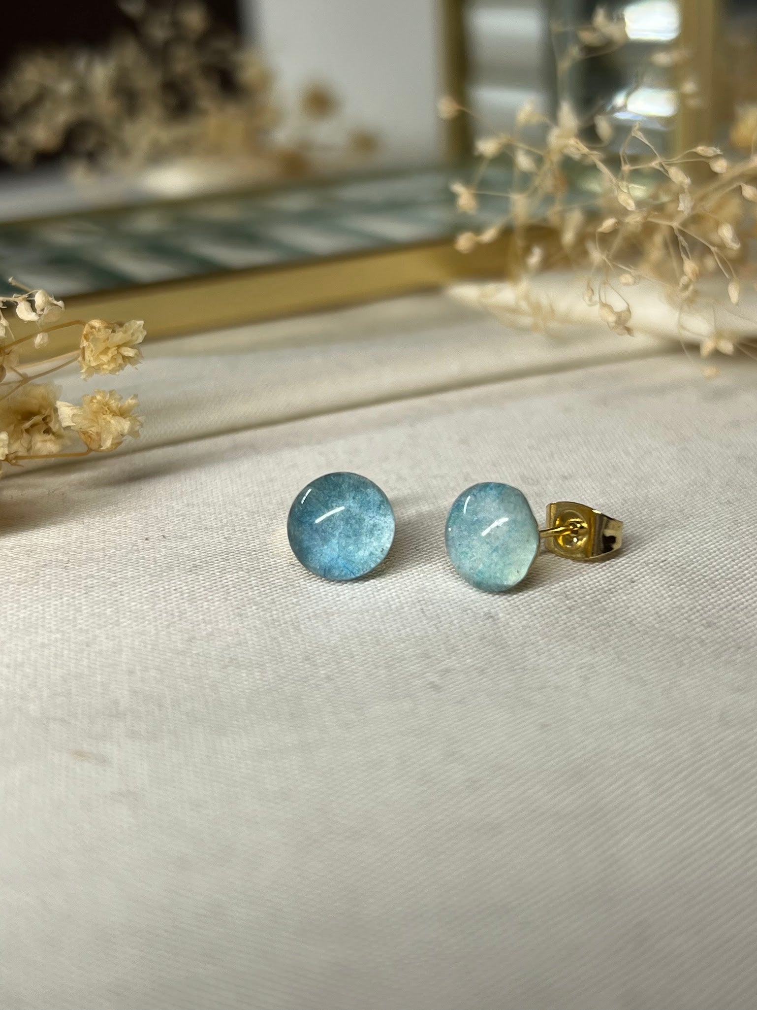 Pendientes hechos a mano, de acero inoxidable y resina UV. Todas las flores son recolectadas, secadas y encapsuladas para su conservación óptima en el tiempo.